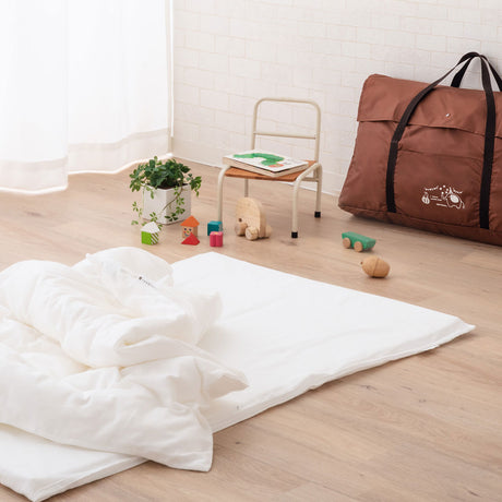 敷き布団・掛け布団・敷き布団カバー・掛け布団カバー・専用バッグの5点セットが一般的です。持ち運びや送り迎えに便利な専用バッグがついているので、届いたらすぐに持っていけます。