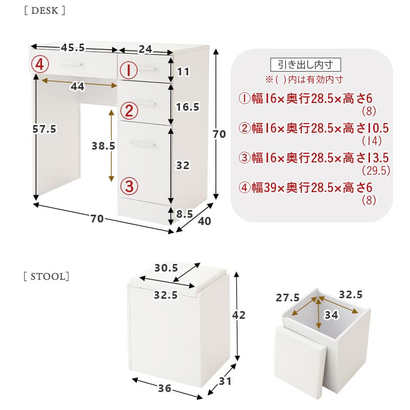 | サイズ | 全体:約幅70×奥行40×高さ117cm デスク:約幅70×奥行40×高さ70cm スツール:約幅36×奥行31×高さ42cm スツール内寸:約幅32.5×奥行27.5×高さ34cm ミラー:約幅58×奥行5×高さ45cm (台座を取り付けた場合:約幅58×奥行12×高さ47cm) |