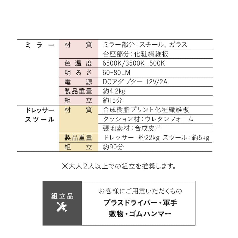 | 組立所要時間 | デスク:約90分 ミラー:約15分 ※ミラーと台座は、お客様取り付けとなります。 ※プラスドライバー・ゴムハンマーをご用意ください。 ※組立時、軍手・敷物があると便利です。 ※大人2人以上での組み立てを推奨しております。 |