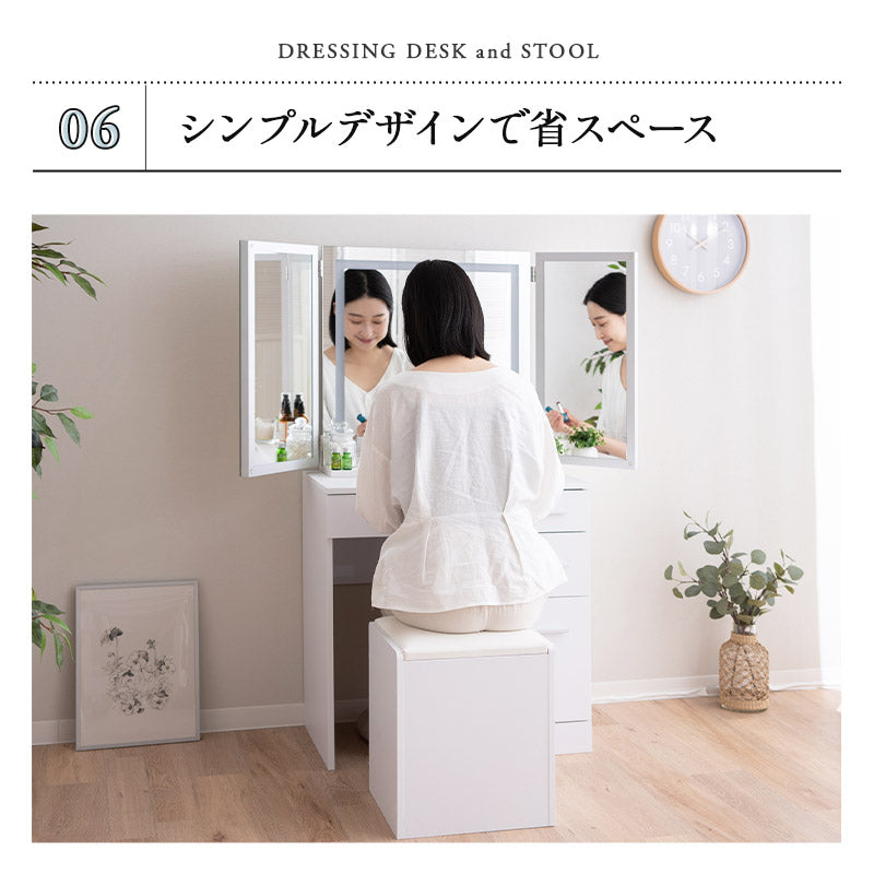 | サイズ | 全体:約幅70×奥行40×高さ131.5cm デスク:約幅70×奥行40×高さ70cm スツール:約幅36×奥行31×高さ42cm スツール内寸:約幅32.5×奥行27.5×高さ34cm 三面鏡(閉じた状態):約幅60×奥行18×高さ61.5cm 三面鏡(開いた状態):約幅120×奥行18×高さ61.5cm |