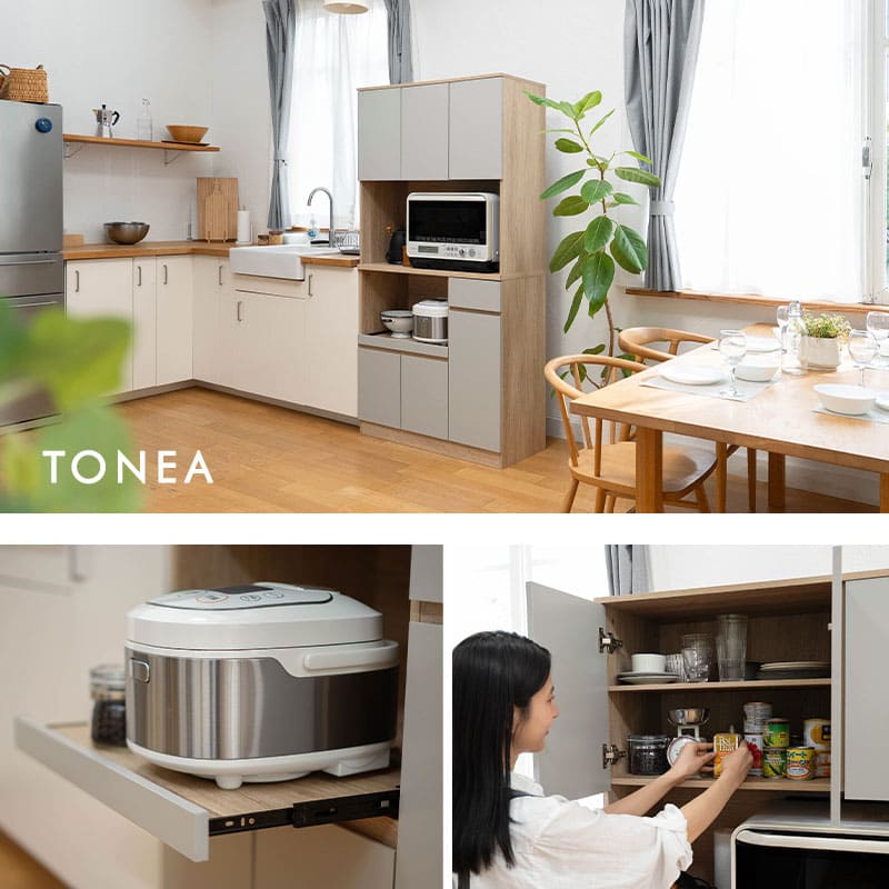 家電や食器を効率よく整理できる収納や2口コンセントなど、充実した機能が備わっています。