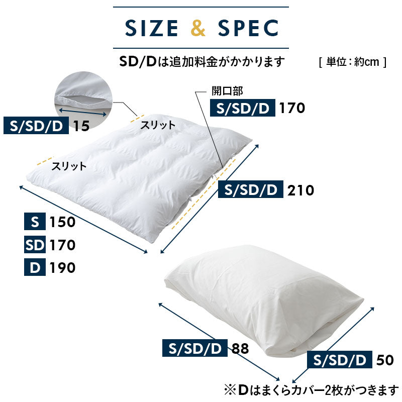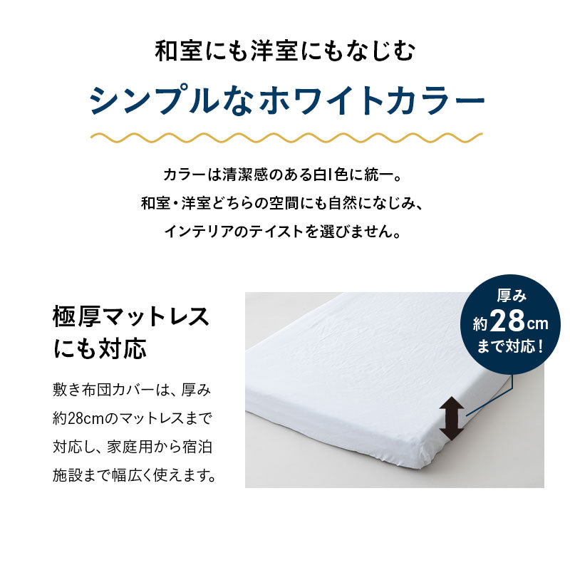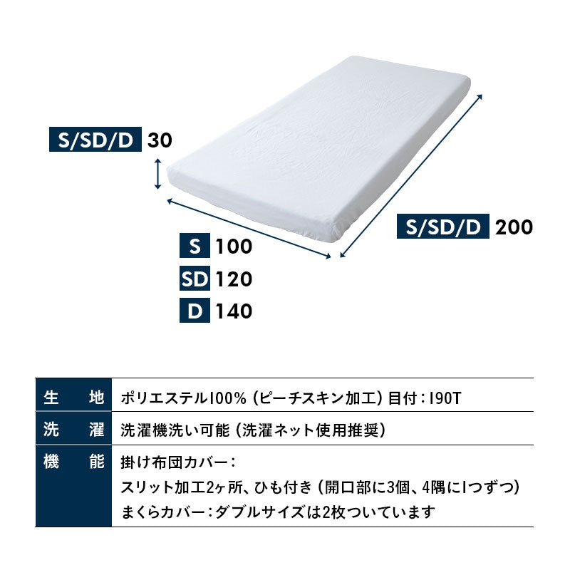 | 敷き布団カバー | シングルサイズ:約幅100×奥行200×マチ30cm セミダブルサイズ:約幅120×奥行200×マチ30cm ダブルサイズ:約幅140×奥行200×マチ30cm ※全周囲ゴム式 (厚さ約28cmまでの敷き布団・マットレスに対応) |