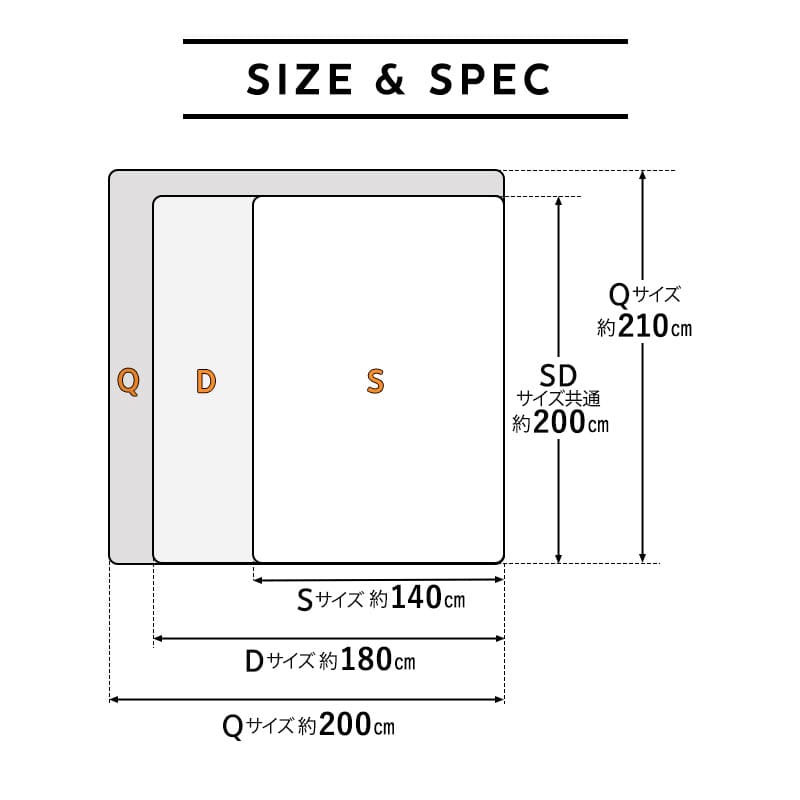 | サイズ | シングルサイズ:約140×200cm ダブルサイズ:約180×200cm クイーンサイズ:約200×200cm |