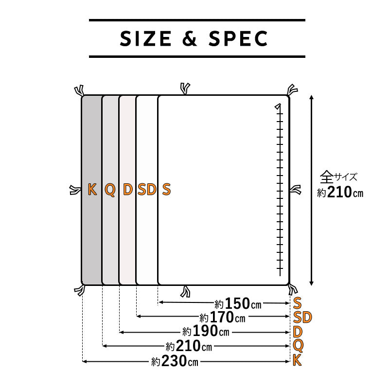 | サイズ | シングルサイズ:約150×210cm セミダブルサイズ:約170×210cm ダブルサイズ:約190×210cm クイーンサイズ:約210×210cm キングサイズ:約230×210cm |
