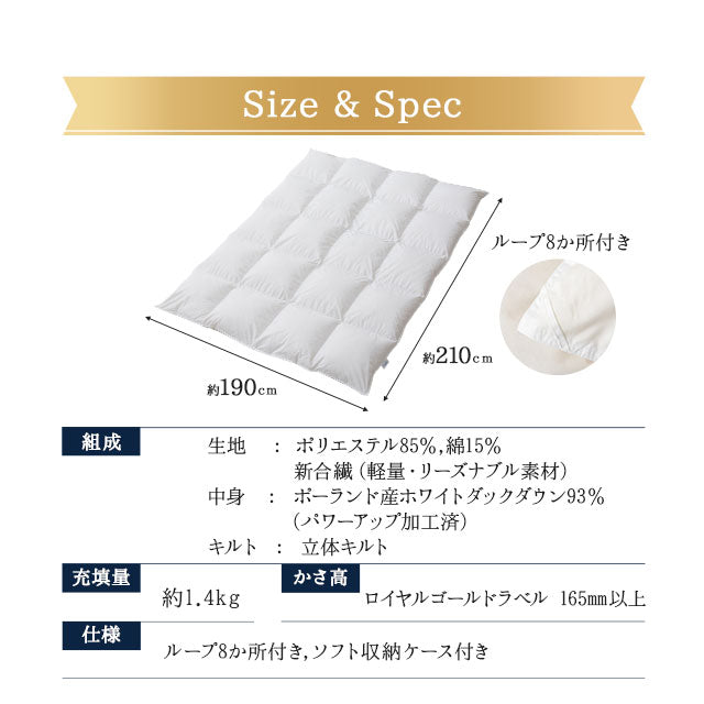 | 組成 | 生地:ポリエステル85%綿15%新合繊(軽量・リーズナブル素材) 中身:ポーランド産ホワイトダックダウン93%(パワーアップ加工済) キルト:立体キルト |