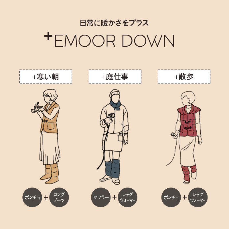 ふわりと軽いEMOOR DOWNは、まるで何も身につけていないかのような驚きの軽さが特長です。