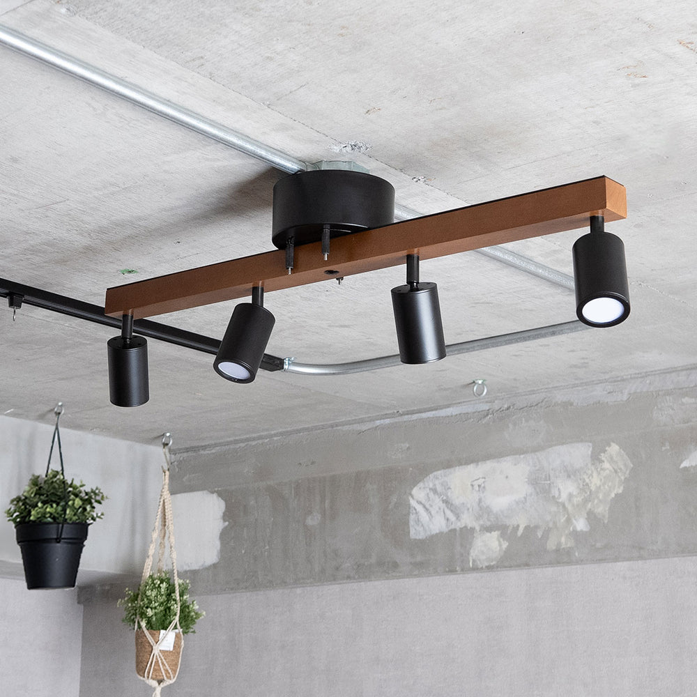 スチールと天然木を組み合わせた4灯シーリングライトは、幅広いインテリアに馴染む洗練されたデザインです。