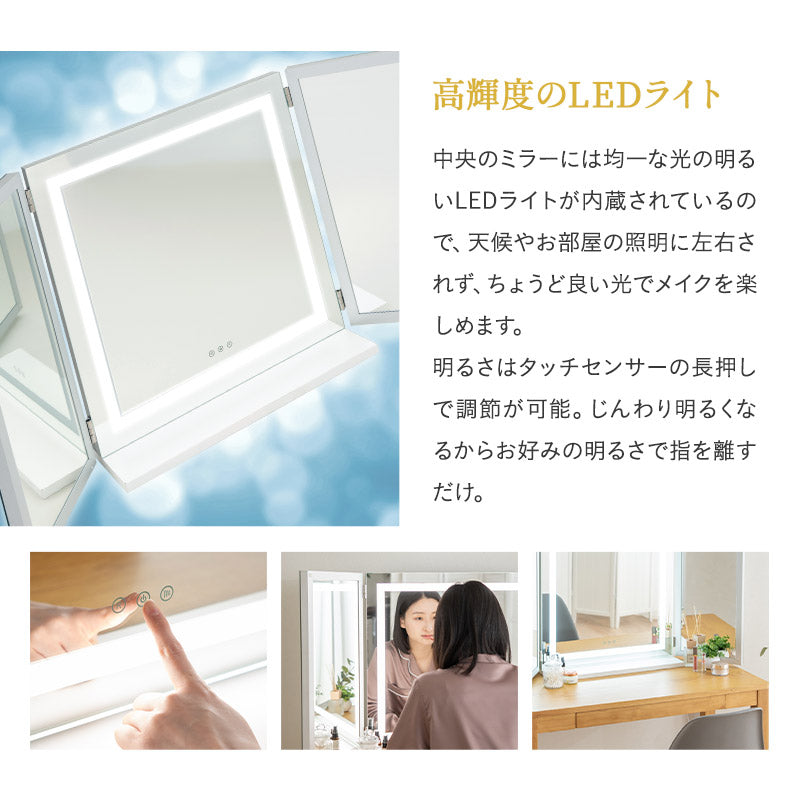 中央のミラーには明るいLEDライトを内蔵し、長押しで好みの明るさに無段階調節できてメイクに便利です。