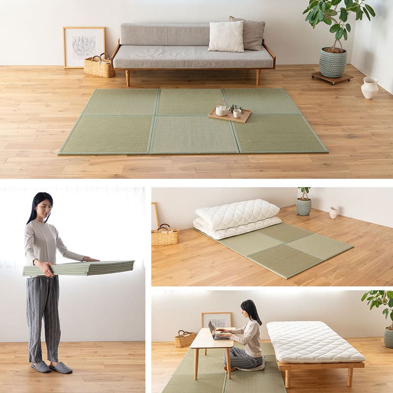 4枚セットはラグ感覚、ダブルサイズ相当の6枚セットは寝具ベースとして活躍し、多彩な空間演出が可能です。