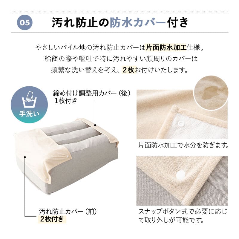 片面防水フェイスカバー2枚付きで、アウターカバーは洗濯機で丸洗いでき、清潔さを保てます。