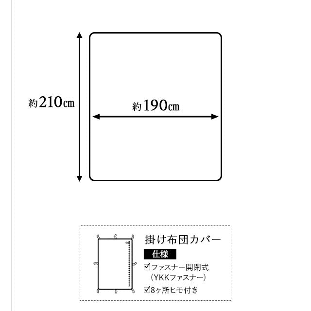 | 仕様 | 掛け布団カバー:ファスナー開閉式(YKKファスナー)、8ヶ所ヒモ付き ボックスシーツ:ゴムフィット式 ピロケース:ファスナー開閉式(YKKファスナー) |