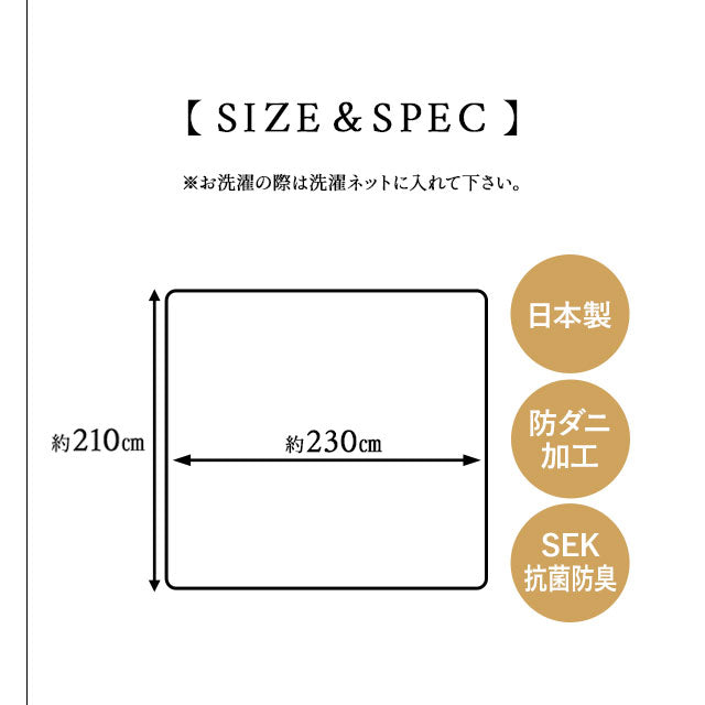 | サイズ | キングサイズ:約230×210cm ※こちらのサイズは生地幅より大きい幅になるため、生地のつなぎが入ります。ご理解・ご了承ください。 |
