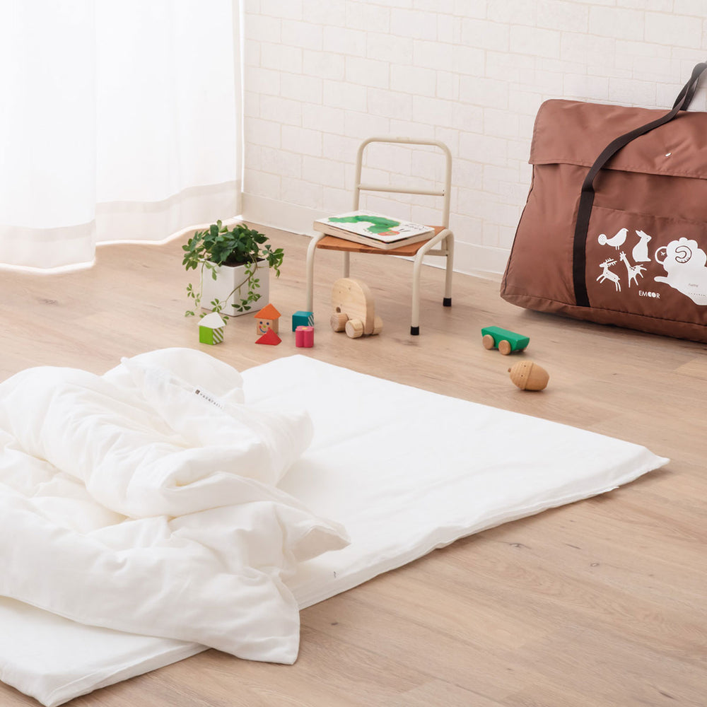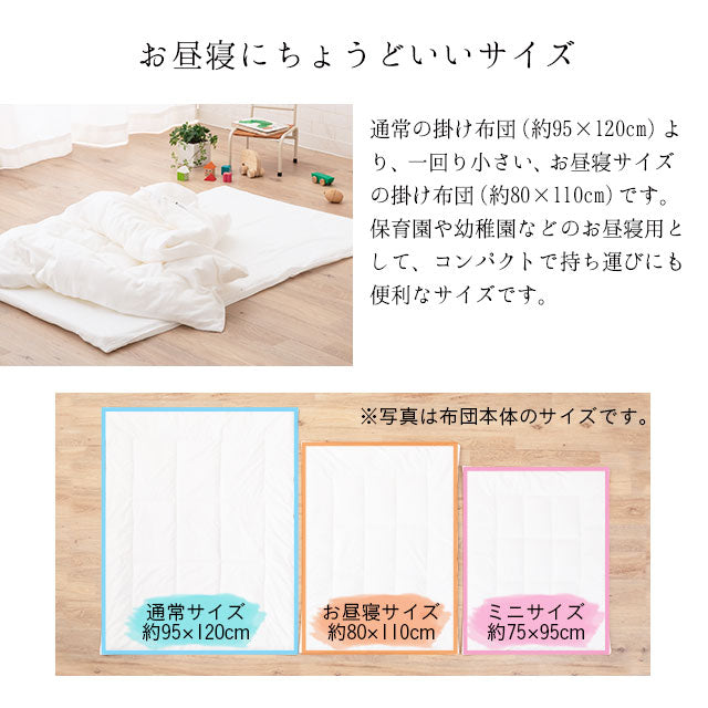 ■お昼寝掛けふとん 約80×110cm(約0.3kg) 側生地:綿100% 中わた:指定外繊維(テンセルR)50%、ポリエステル 50% ■敷きふとん 約80×110cm(約0.3kg) 側生地:綿100% 中わた:指定外繊維(テンセルR) 50%、ポリエステル 50% ■敷きふとん 約70×120cm(約0.6kg) 厚さ:約2.5cm 側生地:ポリエステル80%・綿20%(高密度織) 中わた:ポリエステル100%(テイジン V-LAP使用) ■掛けふとんカバー 約83×110cm 生地:綿100% 無添加和晒し2重ガーゼ ※ファスナー開閉式 ■敷きふとんカバー 約75×125cm 生地:綿100% 無添加和晒し2重ガーゼ ※ファスナー開閉式 ■専用バッグ 約72×42×マチ15cm ナイロン製 |