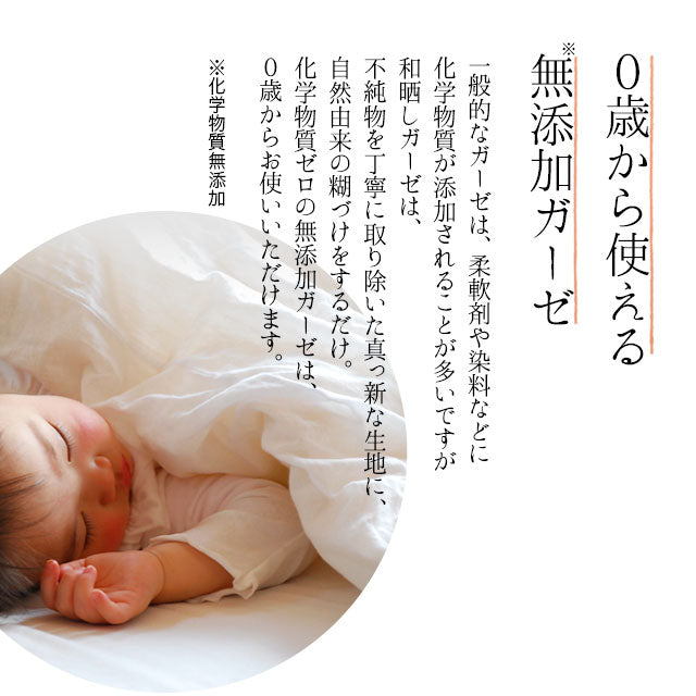 日本伝統の「和晒し」製法で仕上げたガーゼカバーは、化学薬品を使わず敏感肌にも安心です。