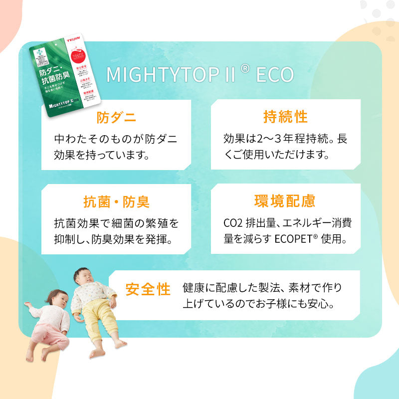 抗菌・防臭・防ダニ機能の「マイティトップII®ECO」中わたを採用しています。