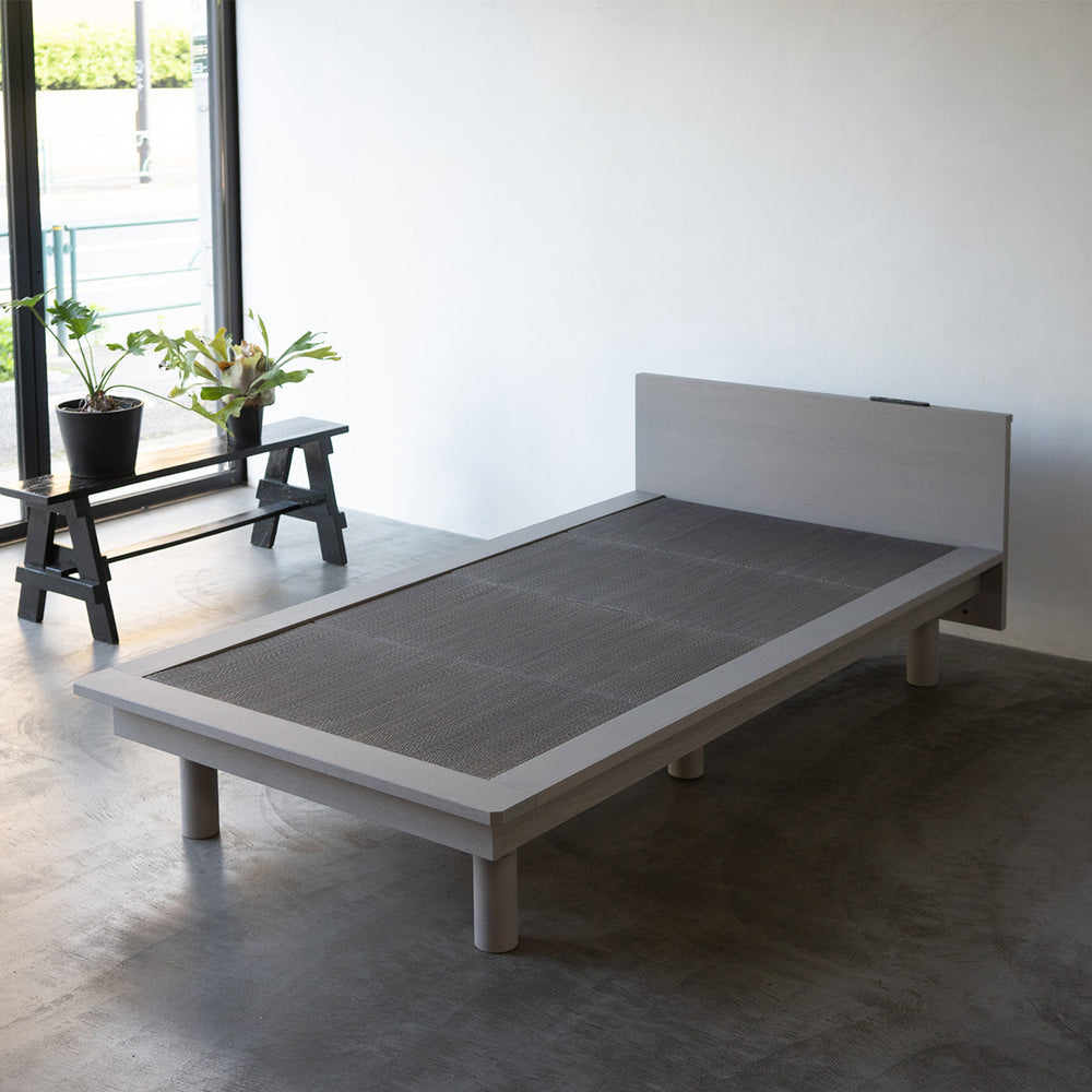 | 素材 | 脚/フットボードの上の辺と側面:タモ無垢材(ウレタン樹脂塗装) その他フレーム:タモ天然木化粧繊維板(ウレタン樹脂塗装) すのこ:桐無垢材 い草畳(表):天然い草 い草畳(芯材):ポリエステル100% い草畳(裏):ポリエステル100%(滑り止め付き) |