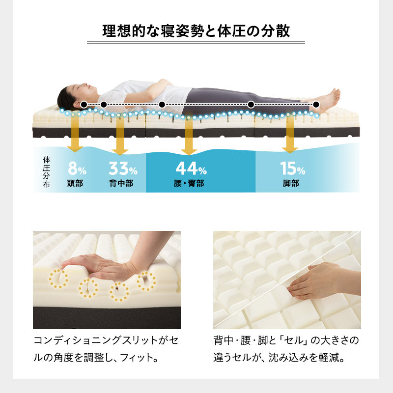 ■サイズ シングルサイズ:約幅97×奥行195×厚さ15cm ■組成 側生地(表面):ポリエステル100%(膨れニット生地) 側生地(側面):ポリエステル100%(ニット生地) 側生地(底面):ポリエステル100%(ハニカムメッシュ生地) インナーカバー:ポリエステル100%(メッシュ生地) 中材(1・2層目):高反発ウレタンフォーム 密度30kg/m³ 180N 中材(3層目):高反発ウレタンフォーム 密度32kg/m³ 220N ■お手入れ方法 側生地:取り外して洗濯機洗い可能(洗濯ネット使用推奨) |