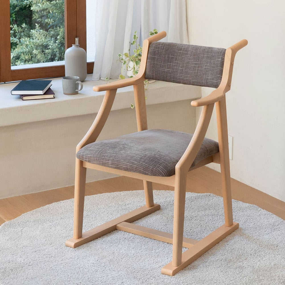 フレームには割れにくく丈夫な楡(ニレ)の無垢材を使用。シートには落ち着いた風合いの生地を組み合わせ、和洋どちらのインテリアにも馴染むデザインです。