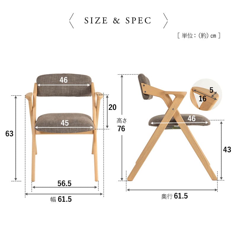 | サイズ | 全体:約幅61.5×奥行61.5×高さ76cm 座面:約幅45×奥行46×高さ43cm 肘の高さ:約63cm 背もたれ:約幅46×長さ18cm ※計測する位置や角度により、若干の誤差が生じる場合があります。 |