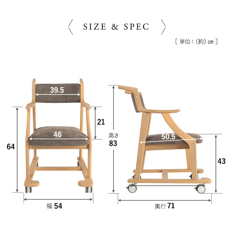 | サイズ | 全体:約幅54×奥行71×高さ83cm 座面:約幅46×奥行50.5×高さ43cm 肘の高さ:約64cm 背もたれ:約幅39.5×長さ17cm ※計測する位置や角度により、若干の誤差が生じる場合があります。 |