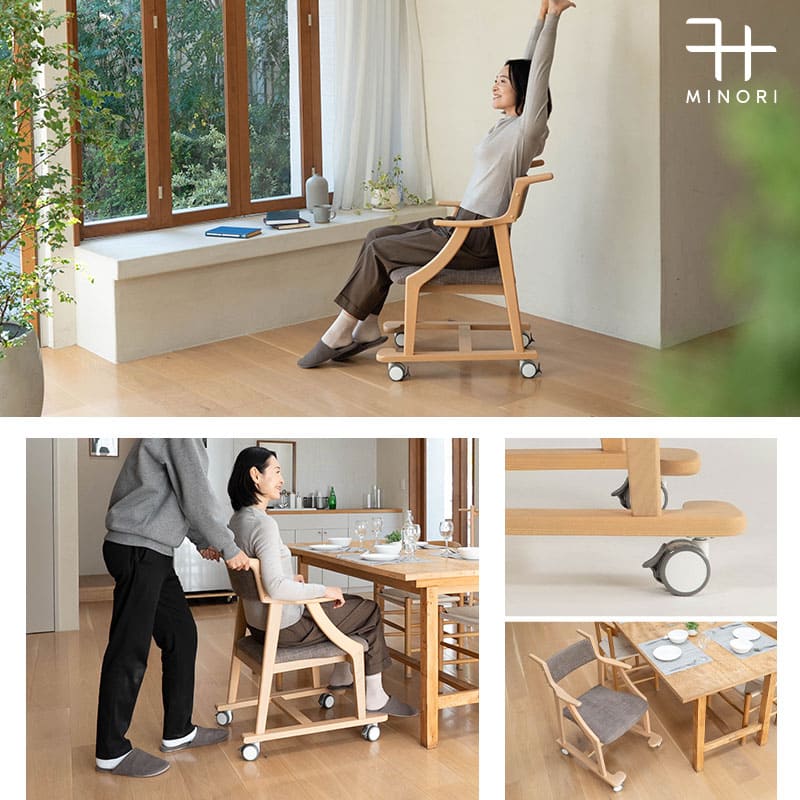 食事のしやすさと食後の軽い休息を両立する設計はそのままに、移動・介助のしやすさを高めたサポートモデルです。