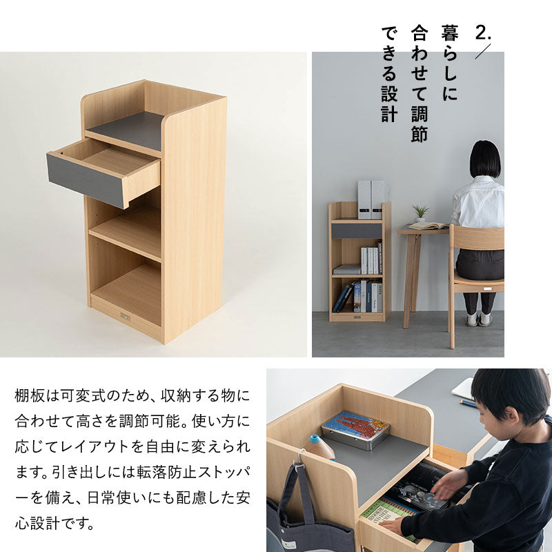 棚板は可変式で、高さ調節が可能。引き出しには転落防止ストッパーを備え、日常使いも安心な設計です。