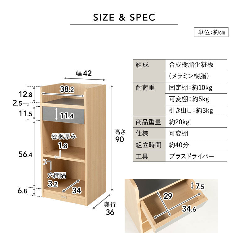 | サイズ | 全体:約幅42×奥行36×高さ90cm 引き出し収納(内寸):約幅34.6×奥行29×深さ7.5cm オープンラック(内寸):約幅38.2×奥行34×高さ56.4cm |