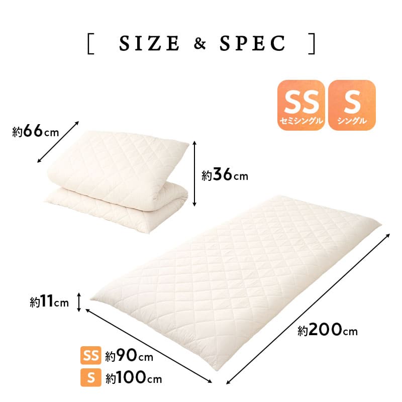 | サイズ | ■セミシングルサイズ 全体:約幅90×奥行200×厚さ11cm (折りたたみ時:約幅90×奥行66×厚さ36cm) ■シングルサイズ 全体:約幅100×奥行200×厚さ11cm (折りたたみ時:約幅100×奥行66×厚さ36cm) |