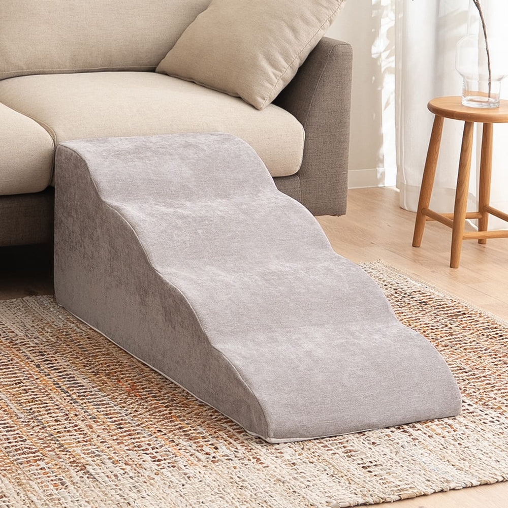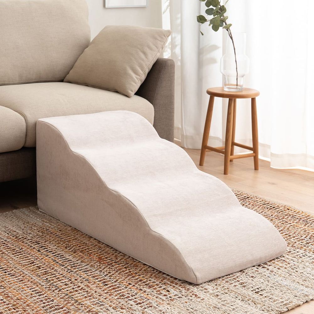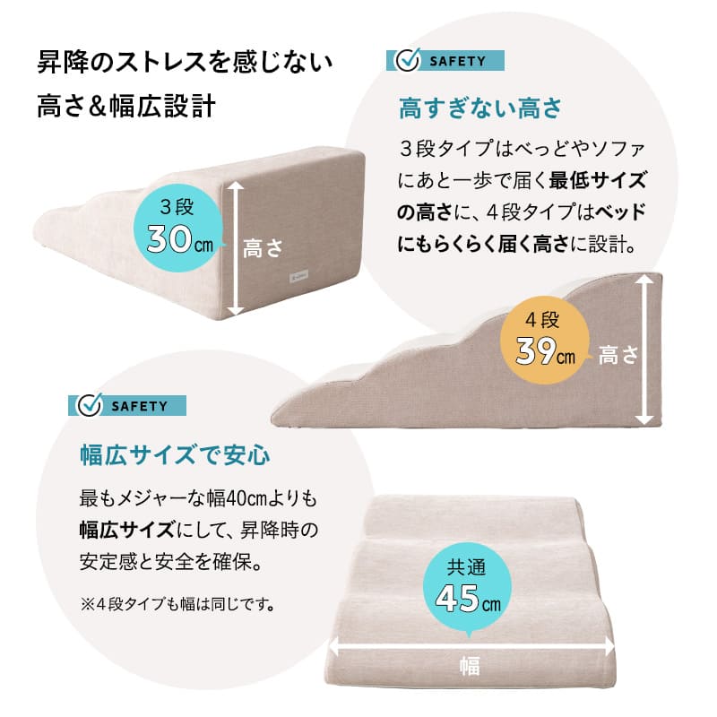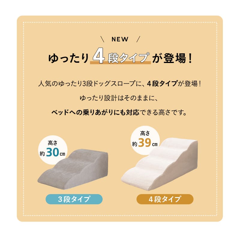 やさしい傾斜設計で、小型犬や高齢犬にも安心して使用できます。新しく登場した4段タイプは、ベッドへの乗りあがりにも対応できる高さを実現。