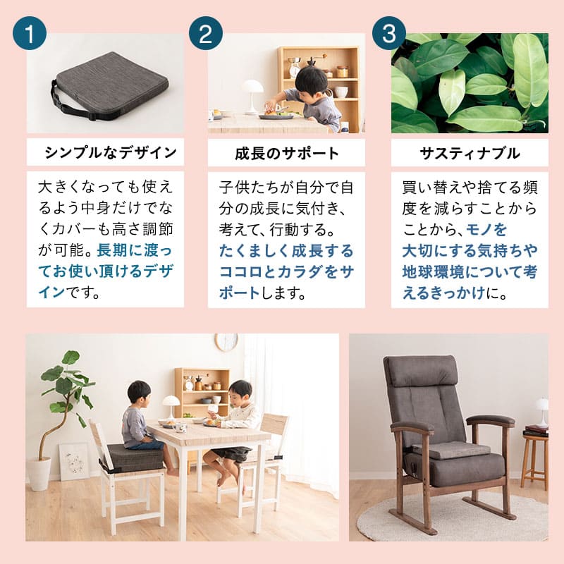 カバーもクッション部も高さ調節可能で、買い替え不要なシンプル設計が特長です。