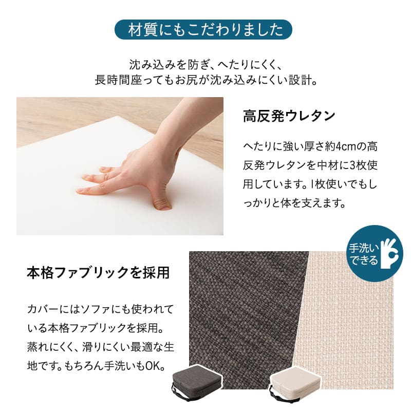 | 素材 | カバー:ポリエステル100%(ソファ生地) 中材:高反発ウレタン 30D (厚さ約4cm×3枚) インナーカバー:不織布 ※縫い込み式のため外せません。 |