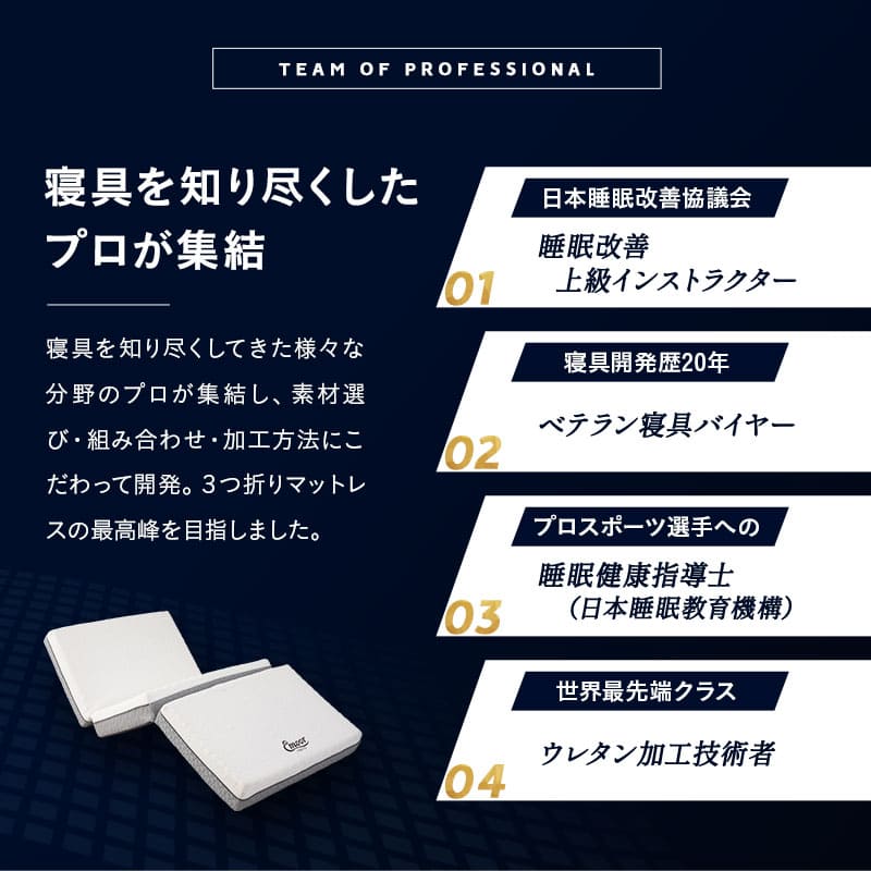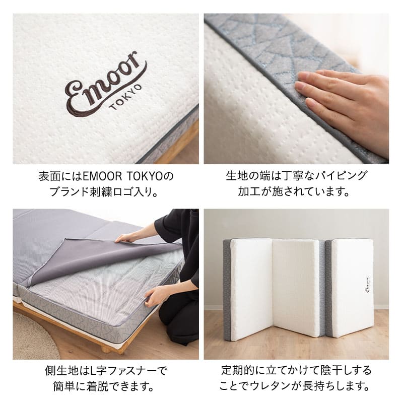 厚み15cmの三つ折り構造と上質な側生地により、快適な寝心地と取り回しの良さを実現しています。
