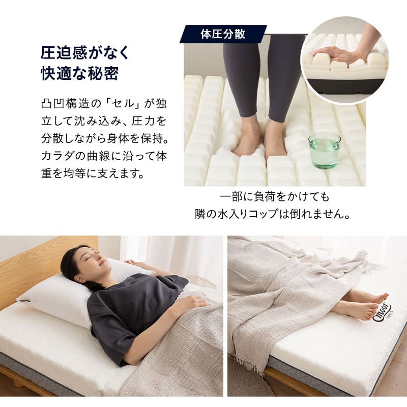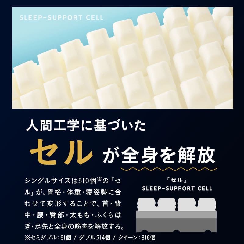 510個(シングルサイズ換算)のセルが身体に合わせて変形し、首から足先までの筋肉を優しくサポート・解放します。