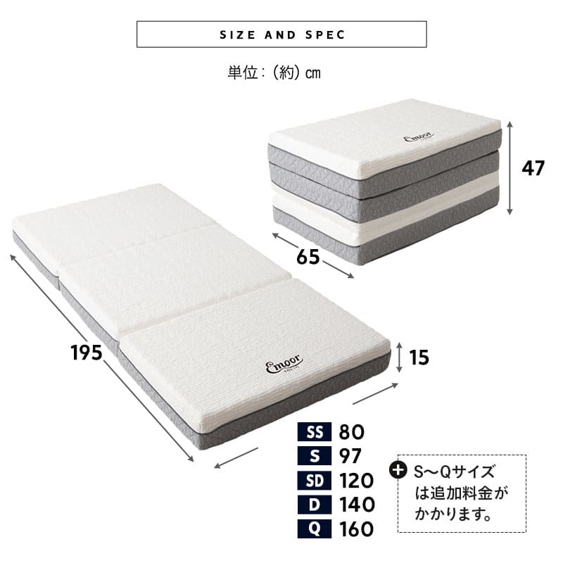 | サイズ | ■セミシングルサイズ 全体:約幅80×奥行195×厚さ15cm (折りたたみ時:約幅80×奥行65×高さ47cm) 重量:約8.45kg ■シングルサイズ 全体:約幅97×奥行195×厚さ15cm (折りたたみ時:約幅97×奥行65×高さ47cm) 重量:約9.8kg ■セミダブルサイズ 全体:約幅120×奥行195×厚さ15cm (折りたたみ時:約幅120×奥行65×高さ47cm) 重量:約12.7kg ■ダブルサイズ 全体:約幅140×奥行195×厚さ15cm (折りたたみ時:約幅140×奥行65×高さ47cm) 重量:約14.6kg ■クイーンサイズ 全体:約幅160×奥行195×厚さ15cm (折りたたみ時:約幅160×奥行65×高さ47cm) 重量:約16.8kg |