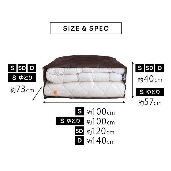 | 収納目安 | ■シングルサイズ シングルサイズの掛け布団・敷き布団・枕1~2個程度 ■シングルゆとりサイズ シングルサイズの掛け布団・敷き布団・枕1~2個・布団カバーや毛布2点程度 ■セミダブルサイズ セミダブルサイズの掛け布団・敷き布団・枕1~2個程度 ■ダブルサイズ ダブルサイズの掛け布団・敷き布団・枕1~2個程度 |