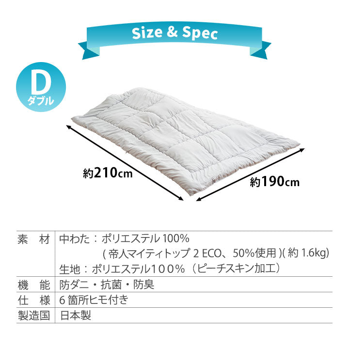 | 素材 | 生地:ポリエステル100%(ピーチスキン加工) 中わた:ポリエステル100%(帝人マイティトップ®ⅡECO 50%使用) 約1.6kg |