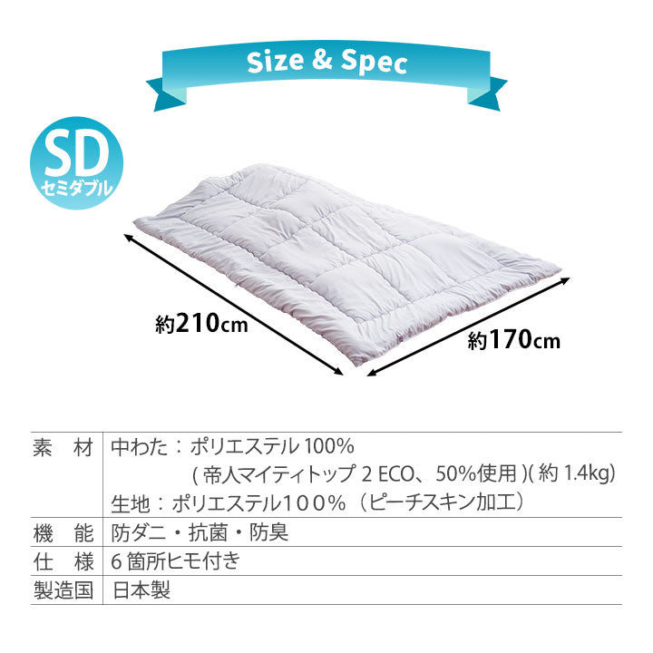 | 素材 | 生地:ポリエステル100%(ピーチスキン加工) 中わた:ポリエステル100%(帝人マイティトップ®ⅡECO 50%使用) 約1.4kg |