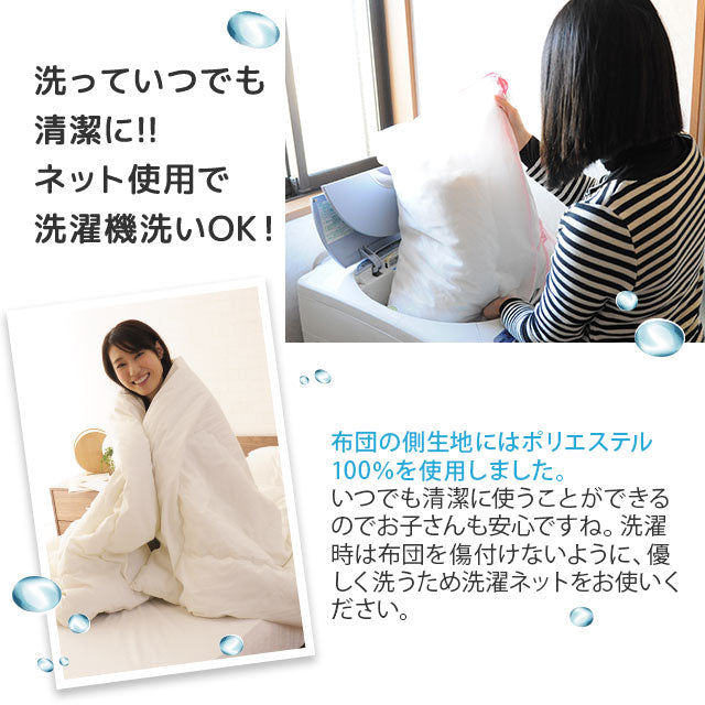 | 素材 | 中わた:ポリエステル100%(帝人マイティトップ2 ECO、50%使用) 約0.8kg 生地:ポリエステル100% 防ダニ生地使用 |