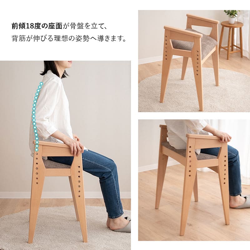 前傾18度の座面設計が骨盤を立て、自然と理想的な姿勢を保てる工夫を実現しています。