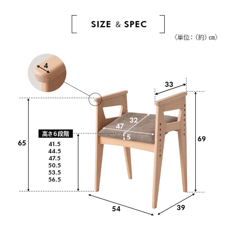 | サイズ | 全体:約幅54×奥行39×高さ69cm 座面:約幅47×奥行32×高さ41.5-56.5cm 座面の勾配:約18度 肘の高さ:約65cm ※計測する位置や角度により、若干の誤差が生じる場合があります。 |