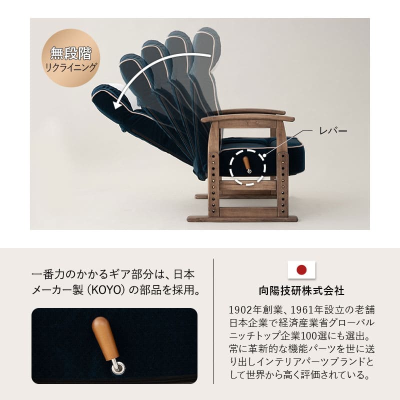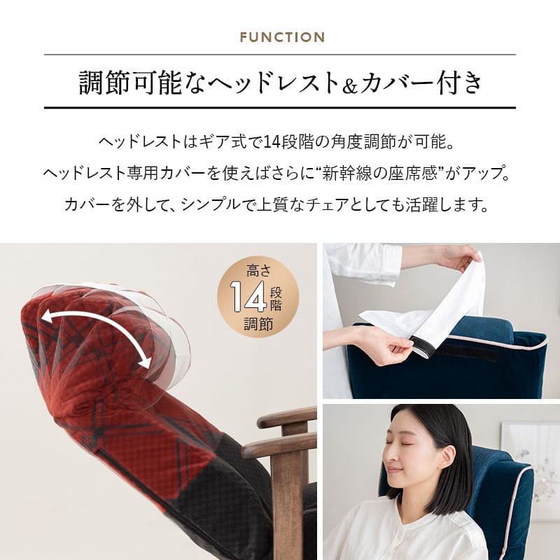 | 仕様 | 頭部:ヘッドレストリクライニング(14段階) 背面:レバー式リクライニング(無段階) |