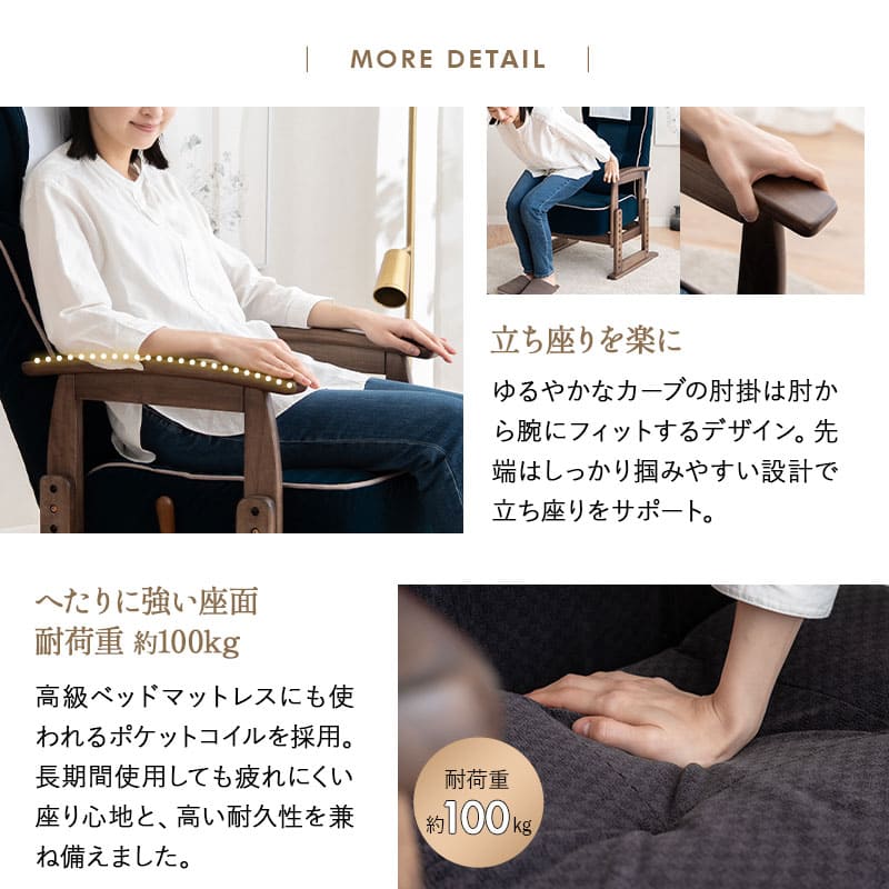 頑丈な構造と安定感のあるスキー脚、さらに立ち座りしやすい肘掛設計で安心して使えます。
