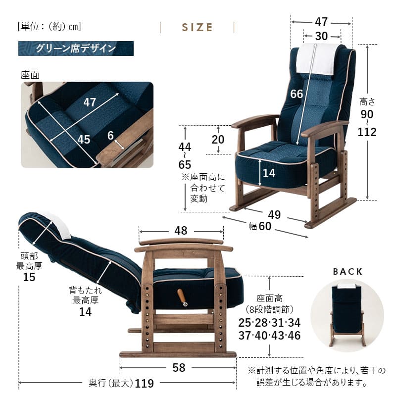 | サイズ | ■普通席デザイン 約幅60×奥行(最大)約95×高さ約94-100cm ■グリーン席デザイン 約幅60×奥行(最大)約119×高さ約90-112cm ※計測する位置や角度により、若干の誤差が生じる場合があります。 |
