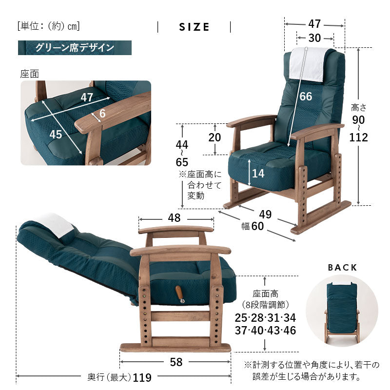 | グリーン席デザイン | ■サイズ 約幅60×奥行(最大)約119×高さ約90-112cm ※計測する位置や角度により、若干の誤差が生じる場合があります。 ■組成 生地:ポリエステル100%、牛革 中材:ポケットコイル、ウレタンフォーム 肘:天然木(ポプラ) ■仕様 頭部:ヘッドレストリクライニング(14段階) 背面:レバー式リクライニング(無段階) 座面:座面高調節可能(8段階) ■商品重量 約14.5kg ■耐荷重 約100kg ■組立 完成品(高さ調節の際は組み立てが必要です) |