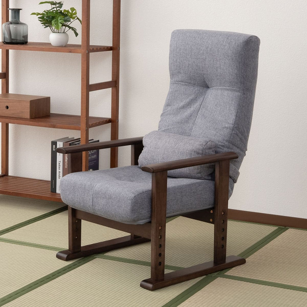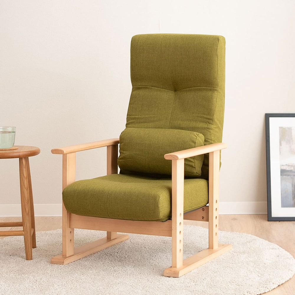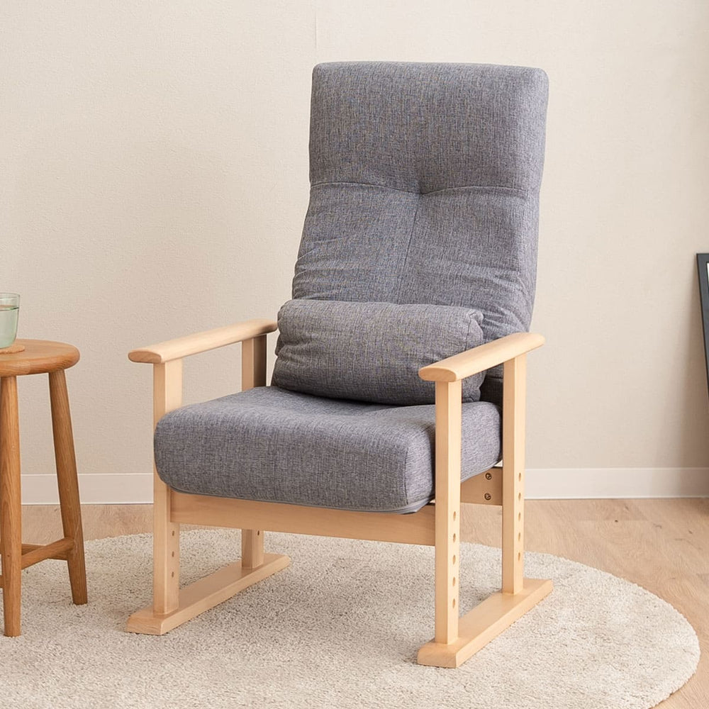 高さ調節は4段階で、体型や暮らしに合わせて負担を軽減し、天然木肘掛けは滑らかな手触りです。