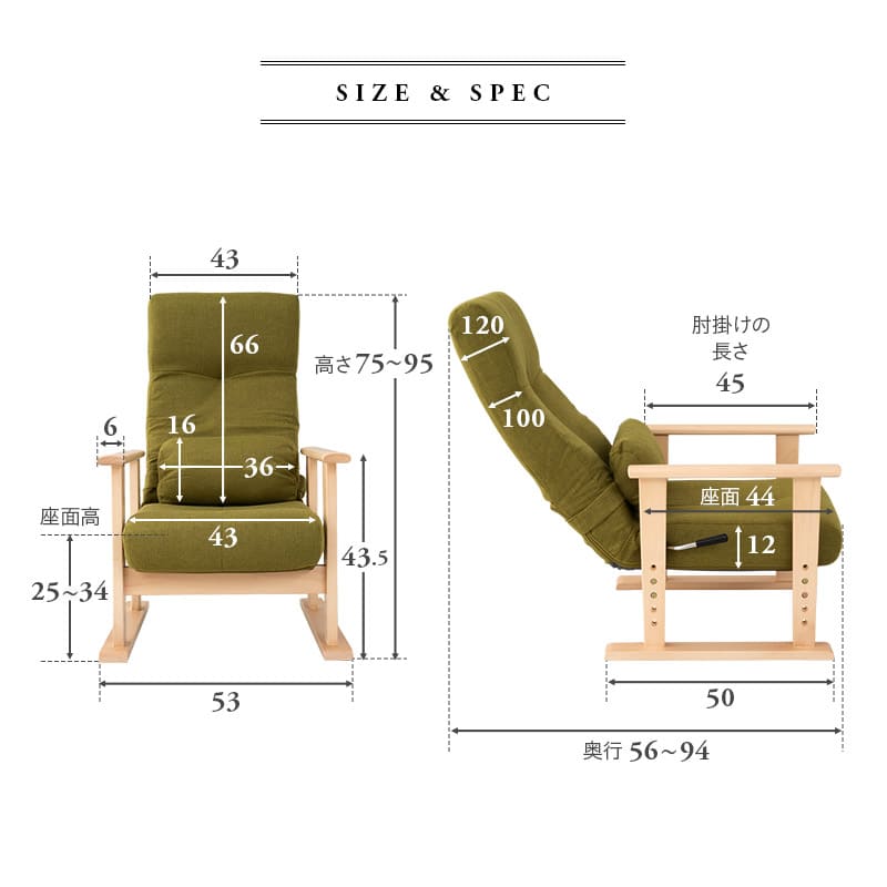 | サイズ | 全体:約幅53×奥行56-89×高さ74-94cm 座面:約幅43×奥行44cm 座面高:25/28/31/34cm(4段階高さ調節) 肘の高さ:約43.5cm 背もたれ:約幅43×長さ66cm ※計測する位置や角度により、若干の誤差が生じる場合があります。 |