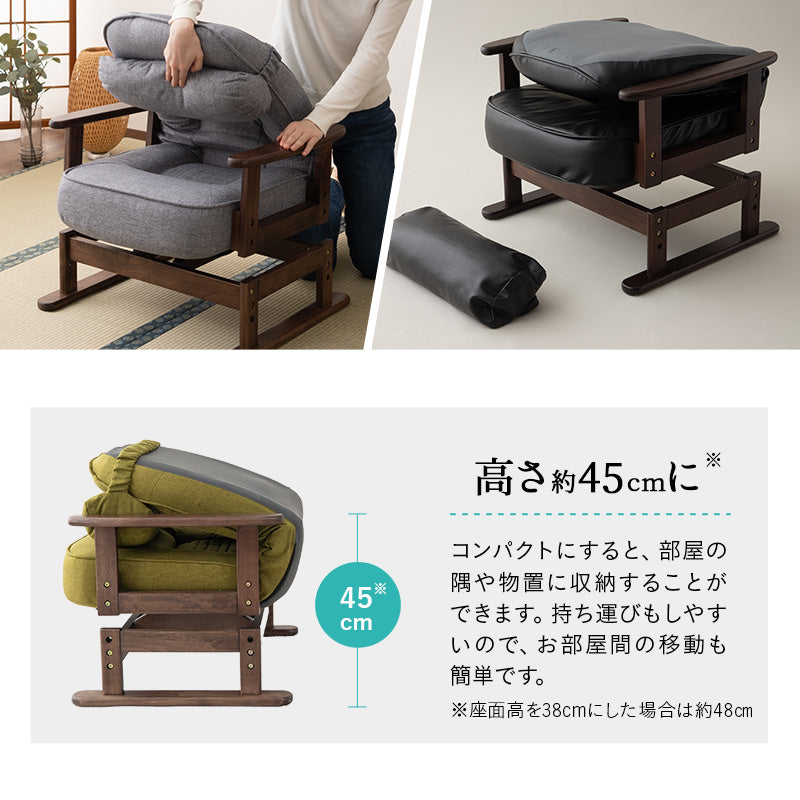 座面高は2段階で調節でき、コンパクトに折りたたんで省スペース収納ができる便利設計です。