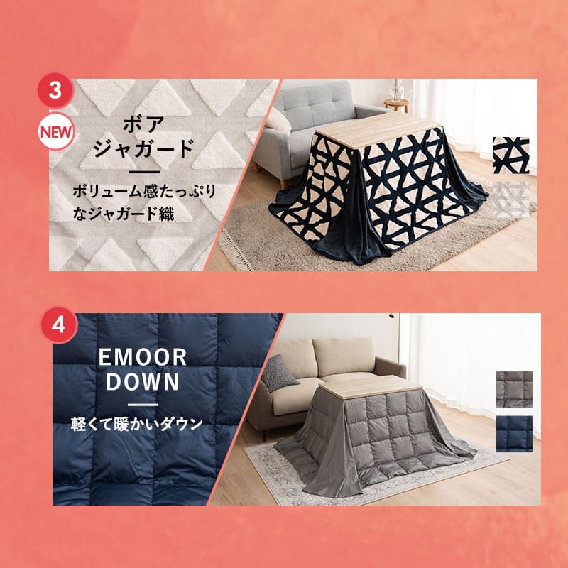 | こたつ掛け布団 | ■サイズ 約幅230×奥行190cm ■組成 <エムールヒート> 表地:ポリエステル100%(フランネルボア) グランド部分:ポリエステル70%、レーヨン30%(HEATWARM 50%使用) 裏地:ポリエステル100%(フリース生地) 中わた:ポリエステル100% フラップ部分:ポリエステル100%(フリース生地) お手入れ方法:洗濯機洗い可能(洗濯ネット使用推奨) <ボアジャガード> 表地:ポリエステル100%(ボアジャガード生地) 中わた:ポリエステル100% 裏地:ポリエステル100%(フランネル生地) フラップ部分:ポリエステル100%(両面フランネル生地) お手入れ方法:手洗い可能 <ジャガードカチオン> 表地:ポリエステル100%(ジャガード生地) 中わた:ポリエステル100% 裏地:ポリエステル100%(フランネル生地) フラップ部分:ポリエステル100%(フリース生地) お手入れ方法:手洗い可能 <エムールダウン> 表地/裏地:ポリエステル100% 中材:ダウン50%、フェザー50% フラップ部分:ポリエステル100% お手入れ方法:手洗い可能 ■カラー <エムールヒート> ブラウン/グレージュ <ボアジャガード> トライアングルホワイト/トライアングルネイビー <ジャガードカチオン> モカブラウン/ライトグレー <エムールダウン> グレー/ネイビー |