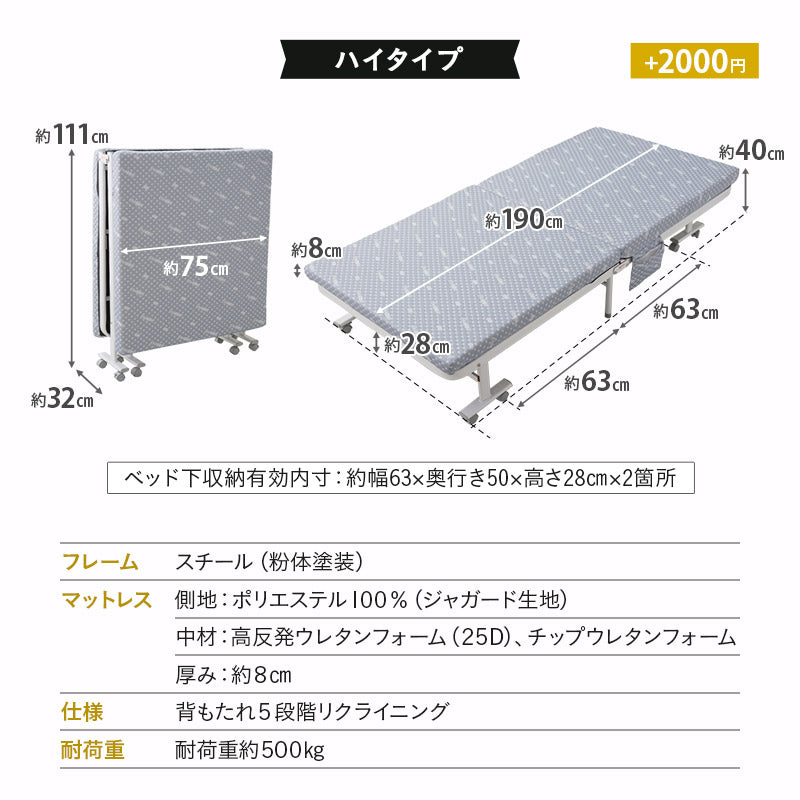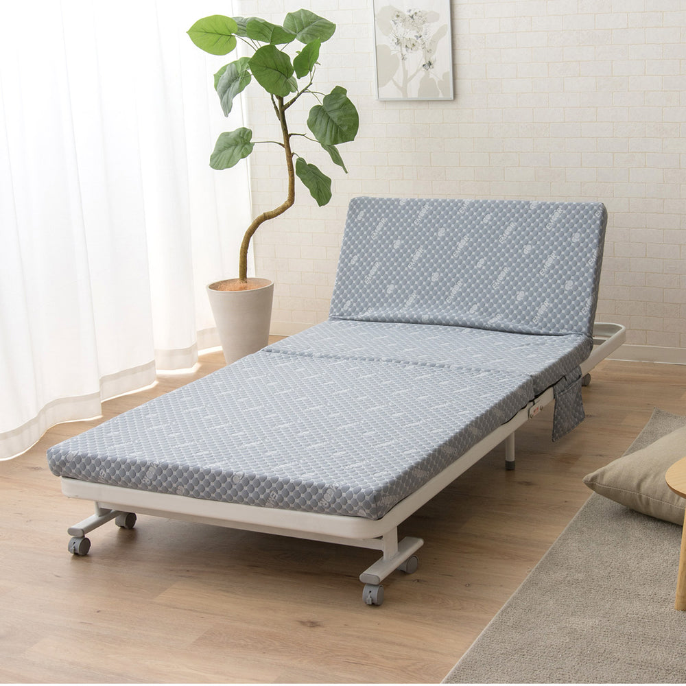 | サイズ | セミシングルサイズ ノーマルタイプ:約幅75×奥行190×高さ28cm (折りたたみ時:約幅75×奥行32×高さ104cm) ハイタイプ:約幅75×奥行190×高さ40cm (折りたたみ時:約幅75×奥行32×高さ111cm) マットレスの厚さ:約8cm |