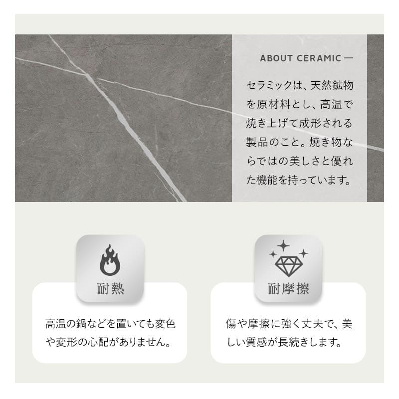 リアルな質感の大理石調セラミック天板を採用し、指紋や汚れが目立ちにくく落ち着いた印象を与えます。